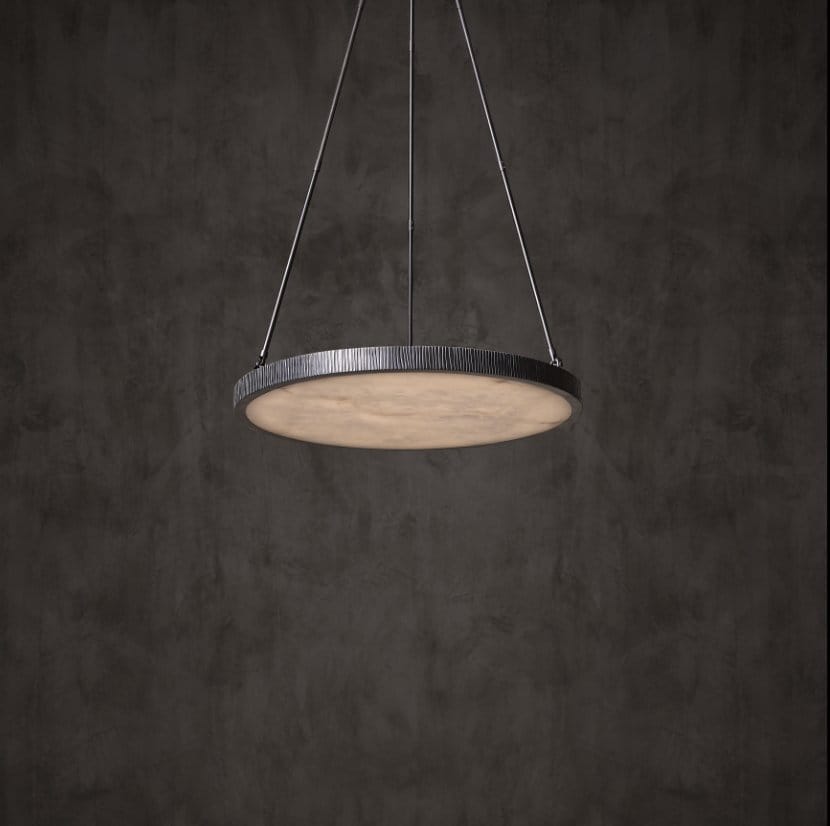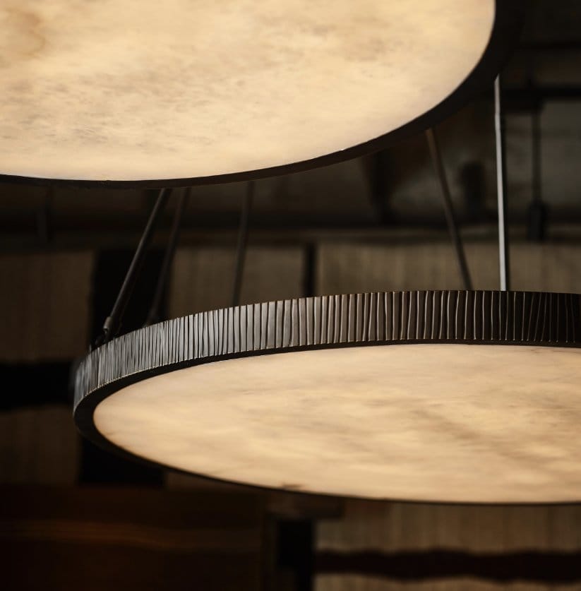 Blending the industrial world with the natural world, the Roda pendant contrasts a metal frame in Lacquered Bronze with a delicate disc of white alabaster, creating a soft ethereal glow as the light passes through it. Prized for its snow-white colour, alabaster was often used by the ancient Egyptians to carve sculptures. The stone is translucent which gives it a beautiful luminosity, with earthy brown and black markings often visible. Playing further with texture and contrast, Roda’s metal frame is cast in a mould to achieve the distinctive textured lines across its surface. Named after the Portuguese word for ‘wheel’ deriving from the Latin word ‘rota’.