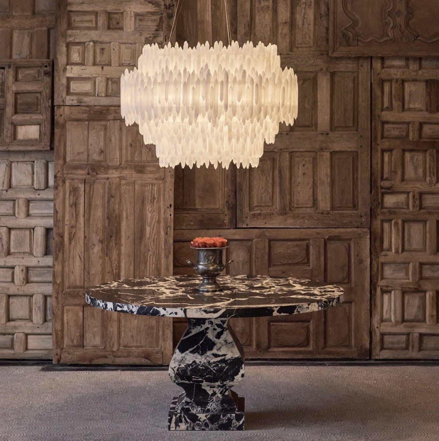 A sculpture in its own right, the Selenite Layer pendant is created entirely by hand using shards of natural selenite. Named after the Greek goddess of the moon, selenite is known for its soft pearlescent glow similar to moonlight. It is the crystalline version of the mineral Gypsum and is revered by many for its spiritual and protective properties with some believing it unlocks the chakra of divine wisdom. The oldest Selenite crystal ever discovered was 500,000 years old in Chihuahua, Mexico. Suspended like glistening stalactites, the crystals in our Selenite Layer lighting collection are painstakingly affixed to the frame one by one.