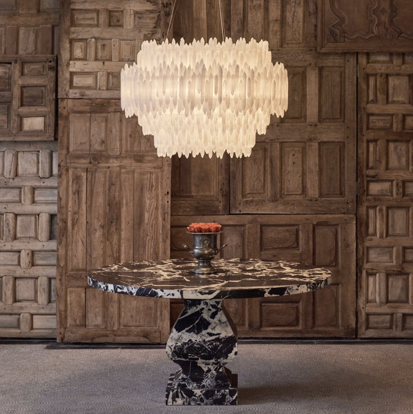 A sculpture in its own right, the Selenite Layer pendant is created entirely by hand using shards of natural selenite. Named after the Greek goddess of the moon, selenite is known for its soft pearlescent glow similar to moonlight. It is the crystalline version of the mineral Gypsum and is revered by many for its spiritual and protective properties with some believing it unlocks the chakra of divine wisdom. The oldest Selenite crystal ever discovered was 500,000 years old in Chihuahua, Mexico. Suspended like glistening stalactites, the crystals in our Selenite Layer lighting collection are painstakingly affixed to the frame one by one.