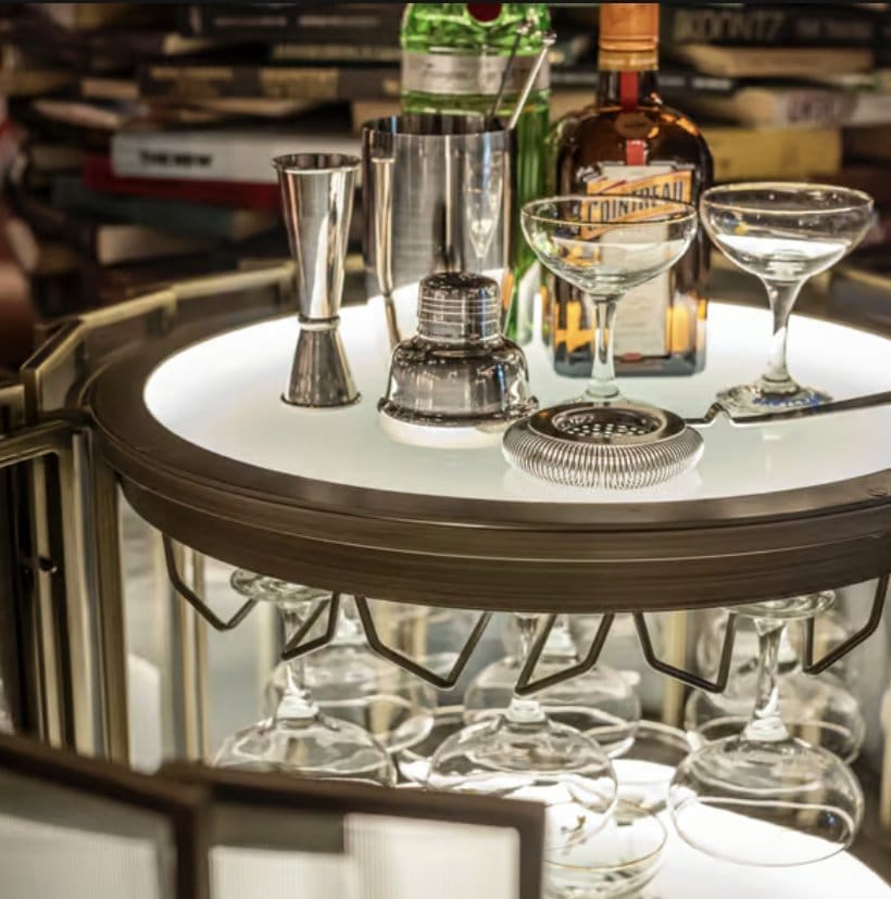 Cocktail hour becomes golden hour with the beautiful Shimmer bar cabinet and its mellow golden glow. Exuding flair and finesse, Shimmer is crafted by hand from a series of overlapping glass panels that wrap all the way around, each one edged entirely in brushed brass. The glass is subtly faceted, refracting the light inside the cabinet to cast a spectacle of shapes that magically trick the eye. A butterfly-style door opens fully to allow easy access to your stock of drinks and glasses inside, with the three round lit glass shelves inside, included a hanging glass rack on the top shelf, housing everything you need for a great night in.