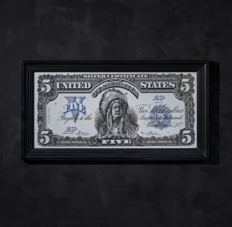Timothy Oulton’s Silver Certificate wall art depicts of one of the most artistically-inspired series of antique U.S. currency, marking the nation’s achievements and history. The bills were designed by prominent American artists and feature personified Neo-Classical motifs. They are considered to be some of the most beautiful monetary designs ever produced by the United States. The bills were redeemable for their face value of silver coins, and are still recognised as valid legal tender today.