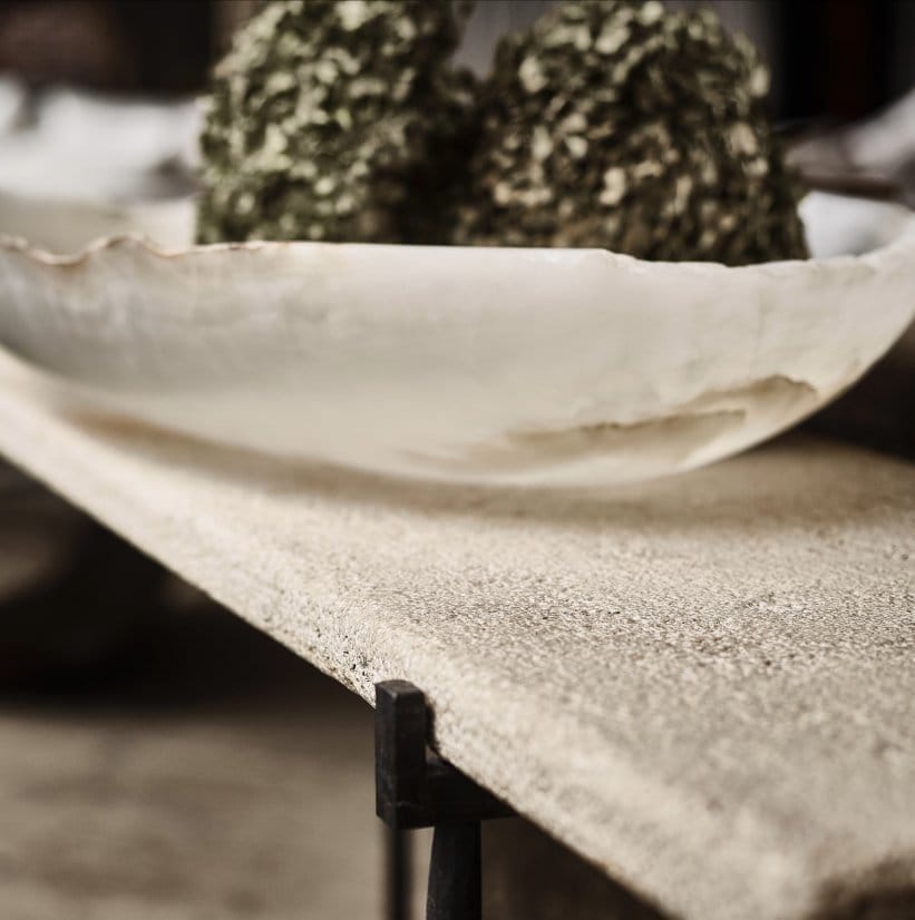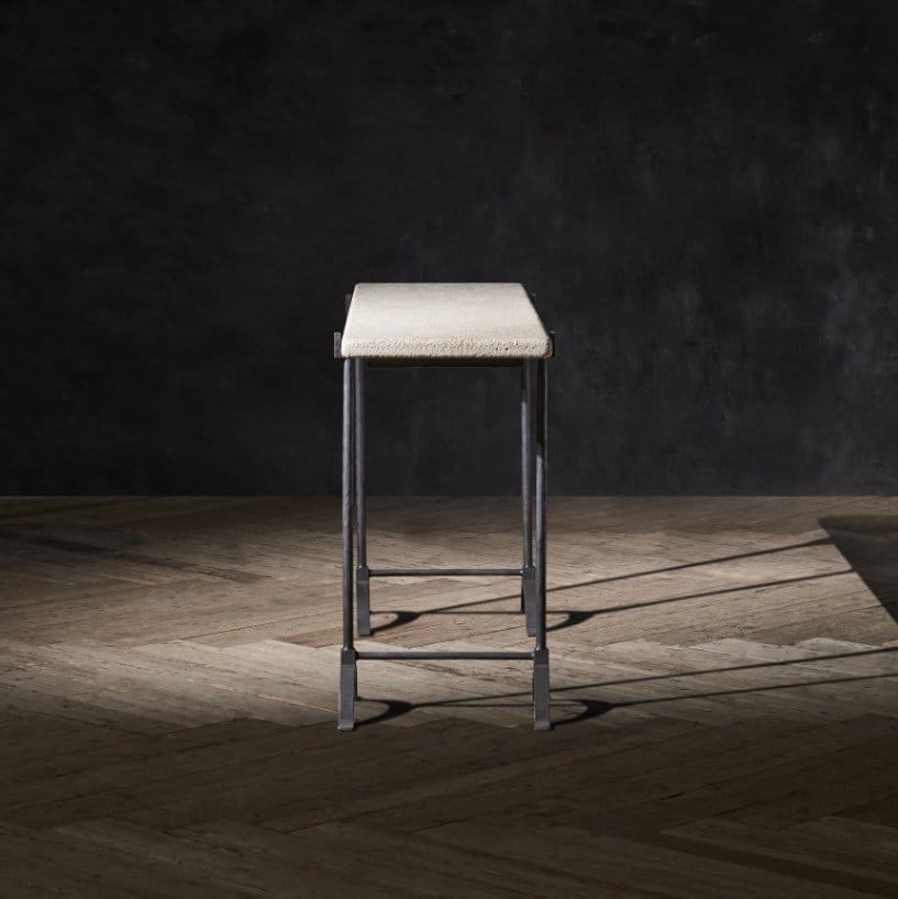 Combining the organic, unrefined beauty of limestone with the old-world charm of wrought iron. The Limestone Trestle table takes inspiration from 19th century trestle tables, at a time when iron first found its way into furniture design. Today, wrought iron is rarely made, and requires the skill of experienced blacksmiths. Contrasting with the wrought iron trestles, a tabletop cut from German limestone sits boldly atop. The stone is hammered by hand across the entire surface to create a lychee finish, so called due to its resemblance with the pitted skin of the lychee fruit. The stone’s beautifully rugged, natural look is the perfect foil to the elegant wrought iron legs.