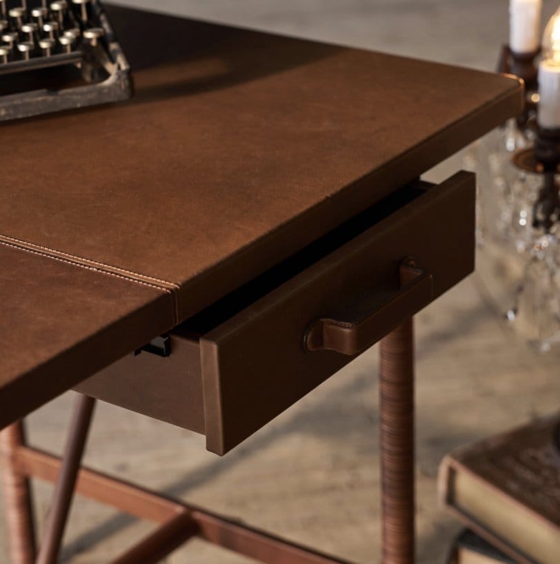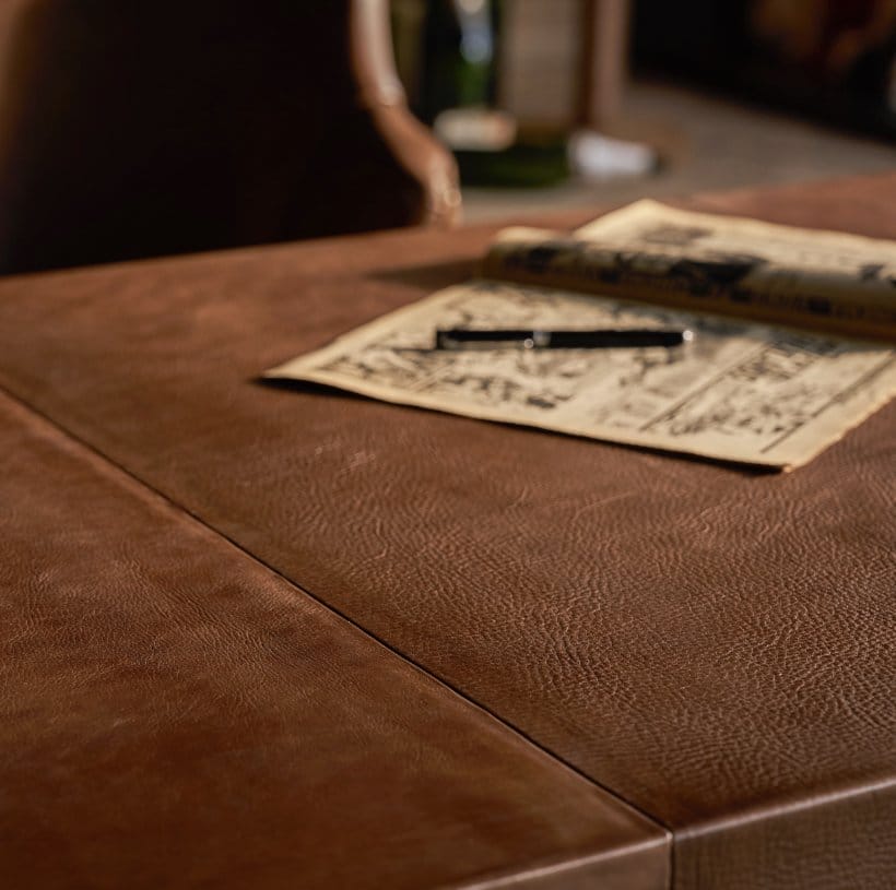 This sleek and distinctive leather desk is inspired by a vintage Art Deco piece from the 1930s. The elegant legs are shaped to emulate bamboo, recalling influences from oriental design. The entire desk including the legs are wrapped in luxuriously thick Cascara leather, veg-tanned in our own sustainable tannery. Cascara is finished by hand for a second time once upholstered to create a subtly distressed look and feel, with the leather developing a beautiful sheen over time. Two desk drawers offer storage, with hand-stitched leather handles.