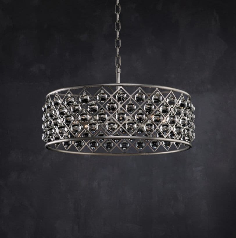 The Zig Zag pendant features delicate spheres of hand-polished glass suspended from an intricate iron skeleton. Like a galaxy of suspended planets, each sphere bounces the reflections and refractions of the others to create a kaleidoscope of patterns.