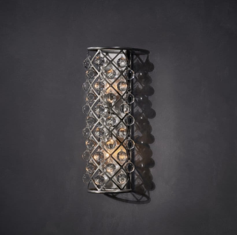 The Zig Zag sconce features delicate spheres of hand-polished glass suspended from an intricate iron skeleton. Like a galaxy of suspended planets, each sphere bounces the reflections and refractions of the others to create a kaleidoscope of patterns.